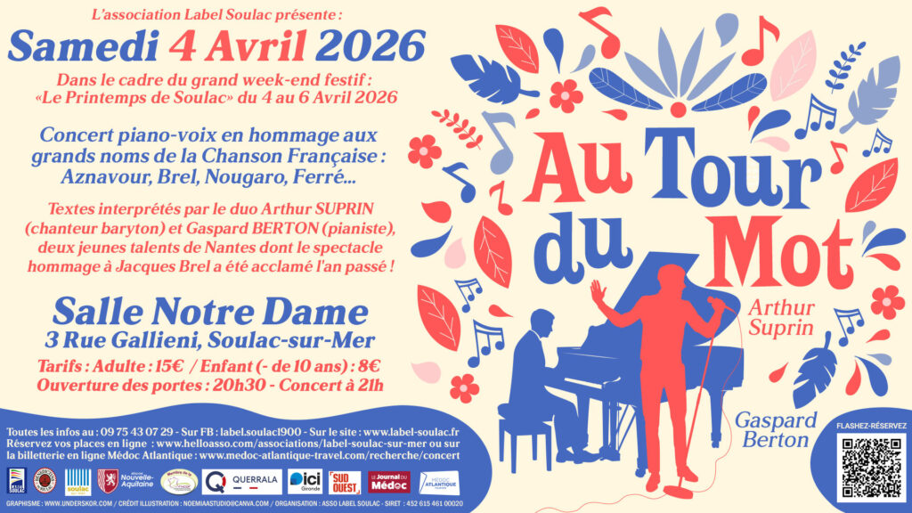 Réservations au spectacle : Directement à l’association Label Soulac – 1 rue Foch à Soulac – 09 75 43 07 29 – tous les matins sauf le mercredi et le week-end ou en ligne avec paiement sécurisé et aux Offices de tourisme Médoc Atlantique, aux guichets – 05 56 09 86 61 – ou en ligne sur www.medoc-atlantique.com.